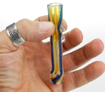 Следующий стеклянный чилим полная противоположность предыдущему экземпляру. Он миниатюрен и изящен, его длина составляет всего лишь 8 см. Соответственно, стаффа поместится буквально на одну затяжку. Это именно тот случай, когда чиллум позиционируется как трубка одного напаса.